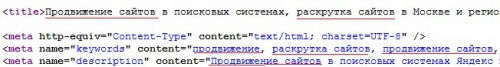 Следует обратить особое внимание на список ключевых слов. Он располагается в строке с мета-тегом «keywords». На рисунке видно, что запрос, по которому продвигается сайт, также содержится в его названии («title») и описании («description»).