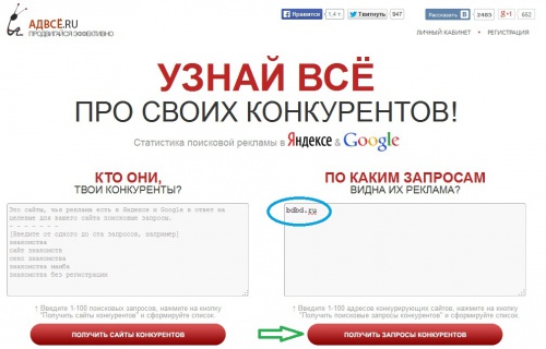 Ниже представлен рисунок, на котором изображена форма ввода. Всё, что необходимо сделать – ввести адрес сайтов (до 100 штук в столбец) в окно (для наглядности обозначено голубым выделением). Далее следует кликнуть по красной кнопке «Получить запросы конкурентов» (обозначена зелёной стрелкой):